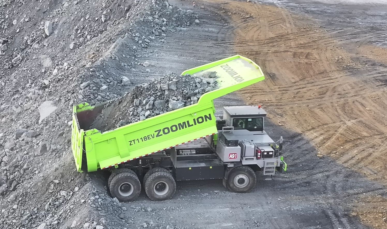 ▲中联重科纯电动非公路宽体自卸车ZT118EV正在作业